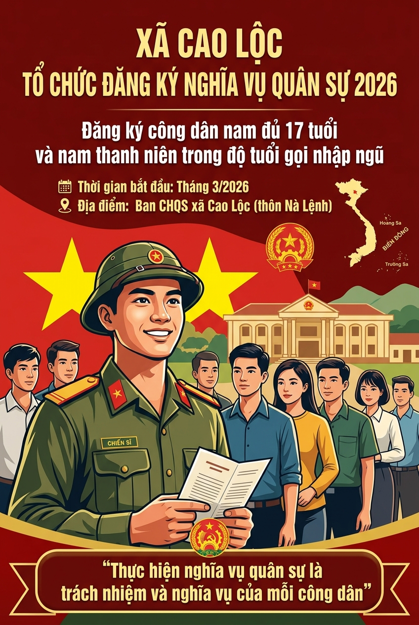 UBND xã Cao Lộc triển khai kế hoạch đăng ký nghĩa vụ quân sự năm 2026 nhằm quản lý chặt chẽ nguồn công dân trong độ tuổi sẵn sàng nhập ngũ, phục vụ công tác tuyển quân năm 2027.