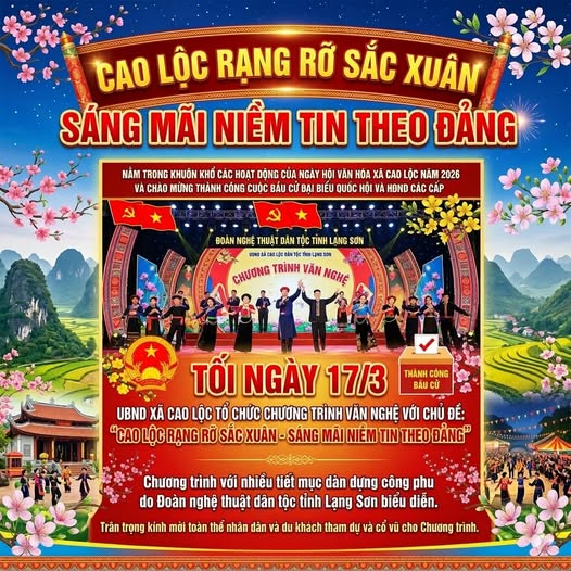 Trong không khí phấn khởi của Ngày hội văn hóa xã Cao Lộc năm 2026 và chào mừng thành công rực rỡ của Cuộc bầu cử đại biểu Quốc hội và HĐND các cấp, UBND xã Cao Lộc tổ chức đêm giao lưu văn nghệ với chủ đề: