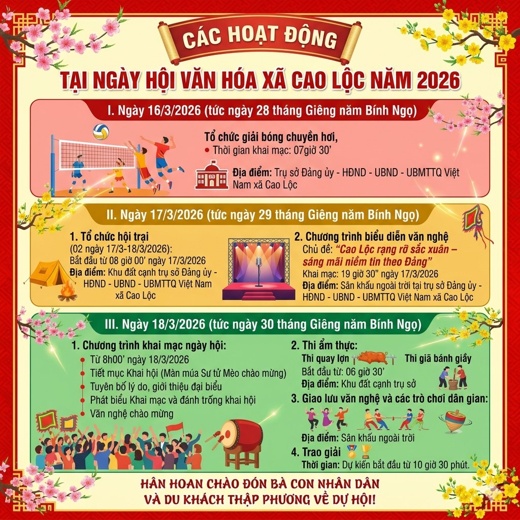 Hòa chung không khí náo nức của những ngày đầu xuân Bính Ngọ, xã Cao Lộc tưng bừng tổ chức Ngày hội Văn hóa năm 2026 với chủ đề: "Cao Lộc rạng rỡ sắc xuân – sáng mãi niềm tin theo Đảng".