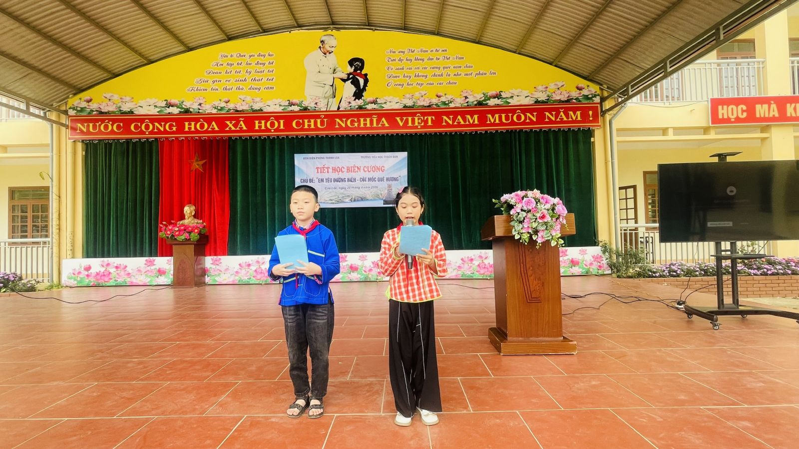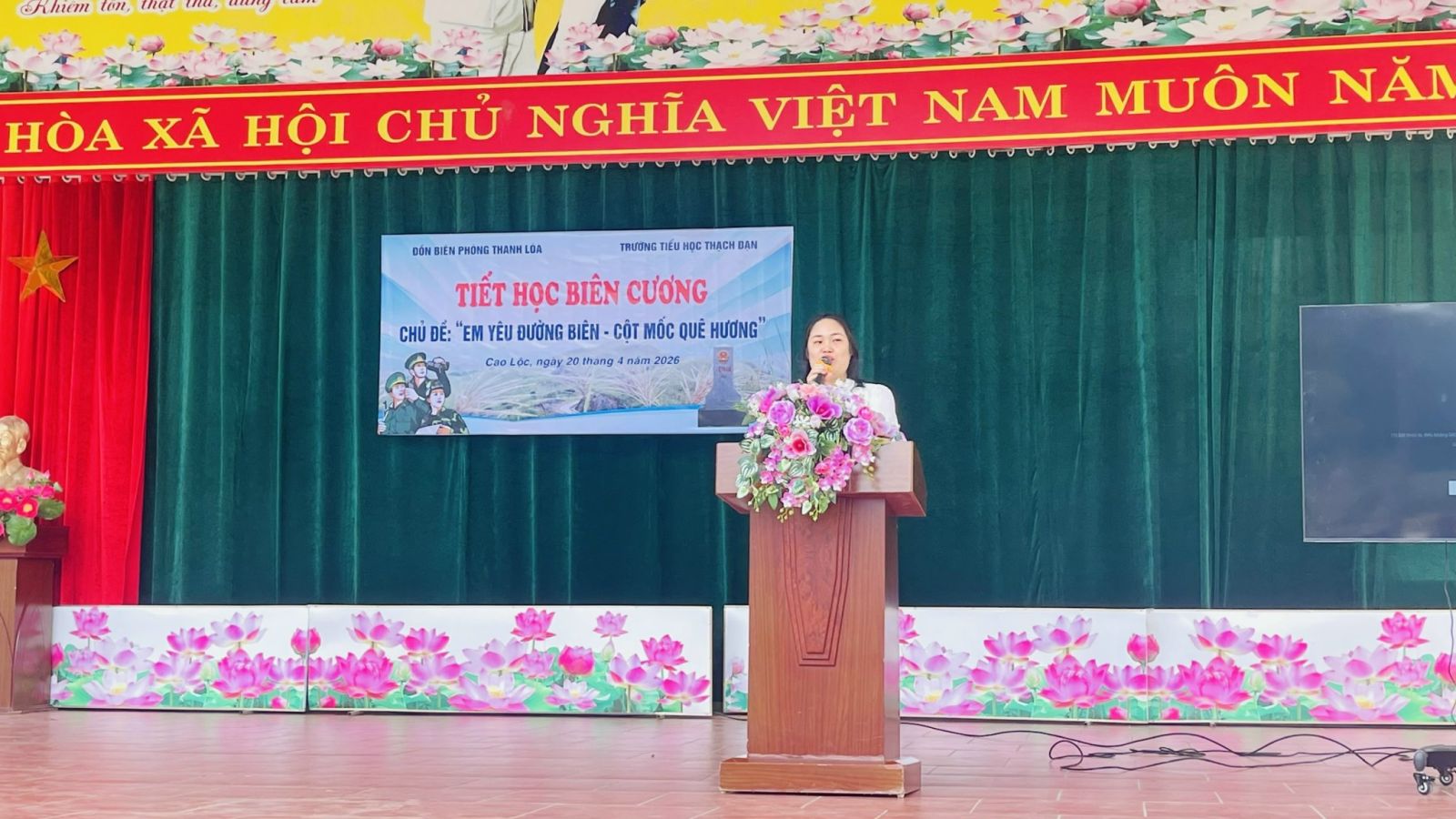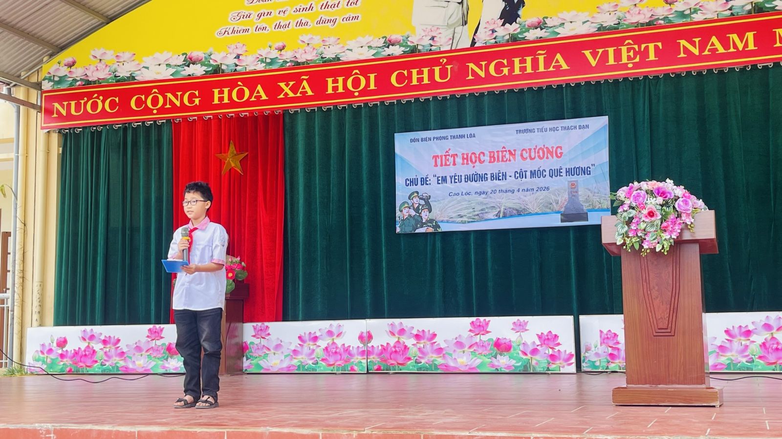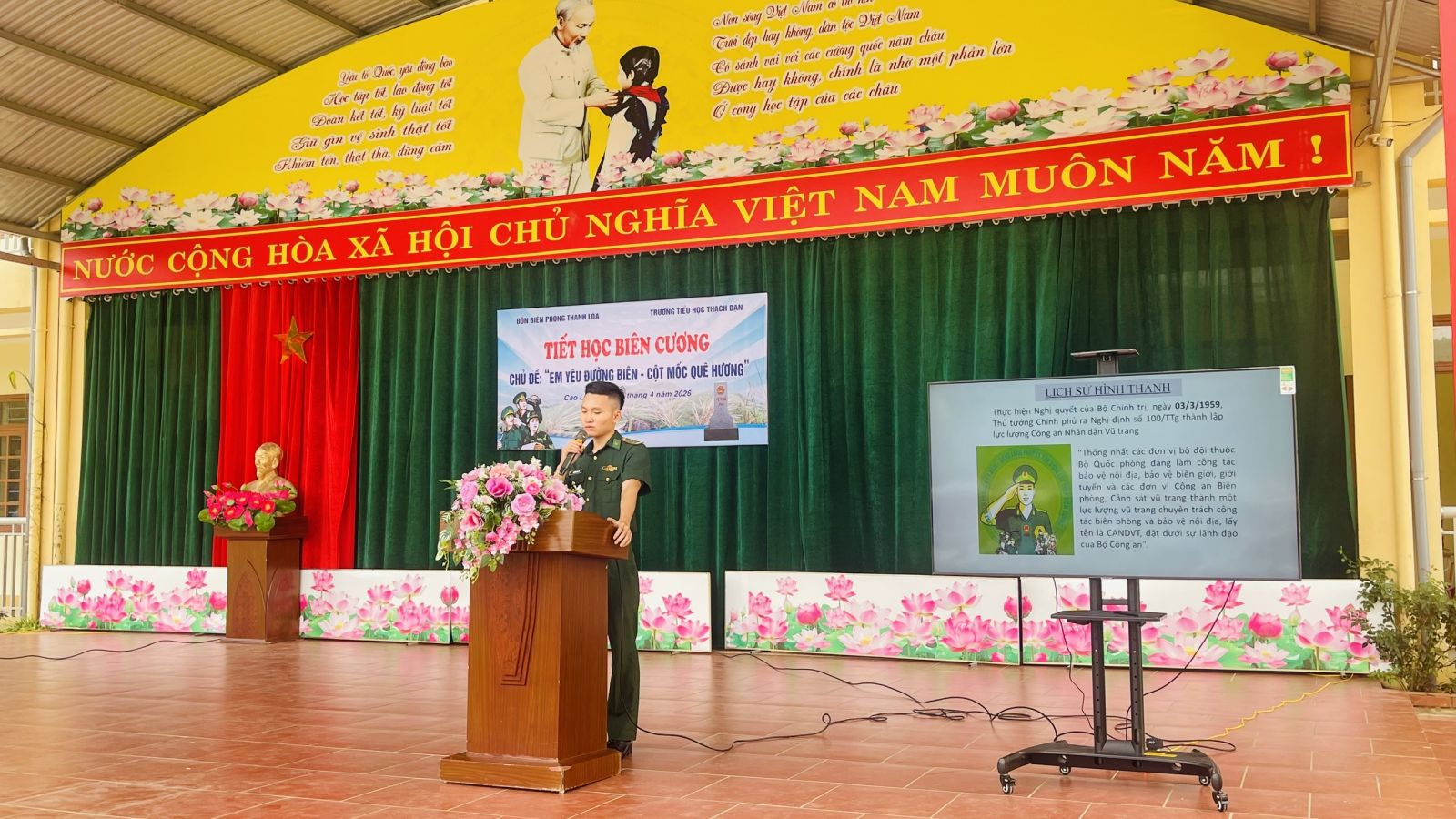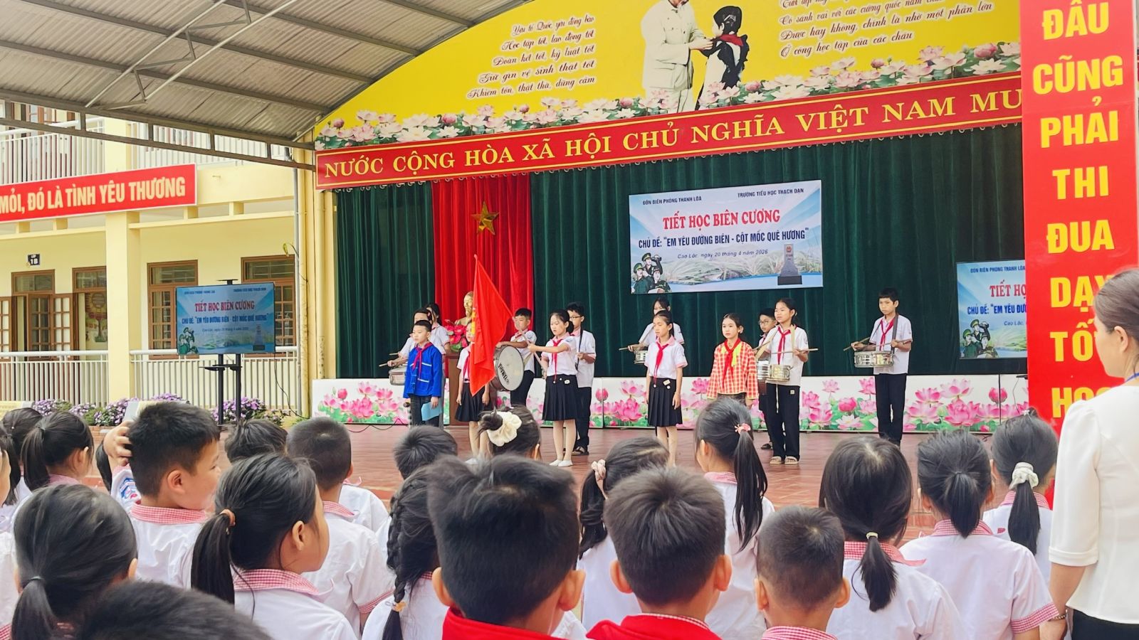 Mở đầu chương trình là các tiết mục văn nghệ đặc sắc do các em học sinh nhà trường biểu diễn, tạo không khí sôi nổi cho tiết học. Sau nghi lễ chào cờ trang nghiêm, đại diện Đồn Biên phòng Thanh Loà đã trực tiếp truyền đạt các nội dung chuyên đề về chủ quyền biên giới quốc gia.